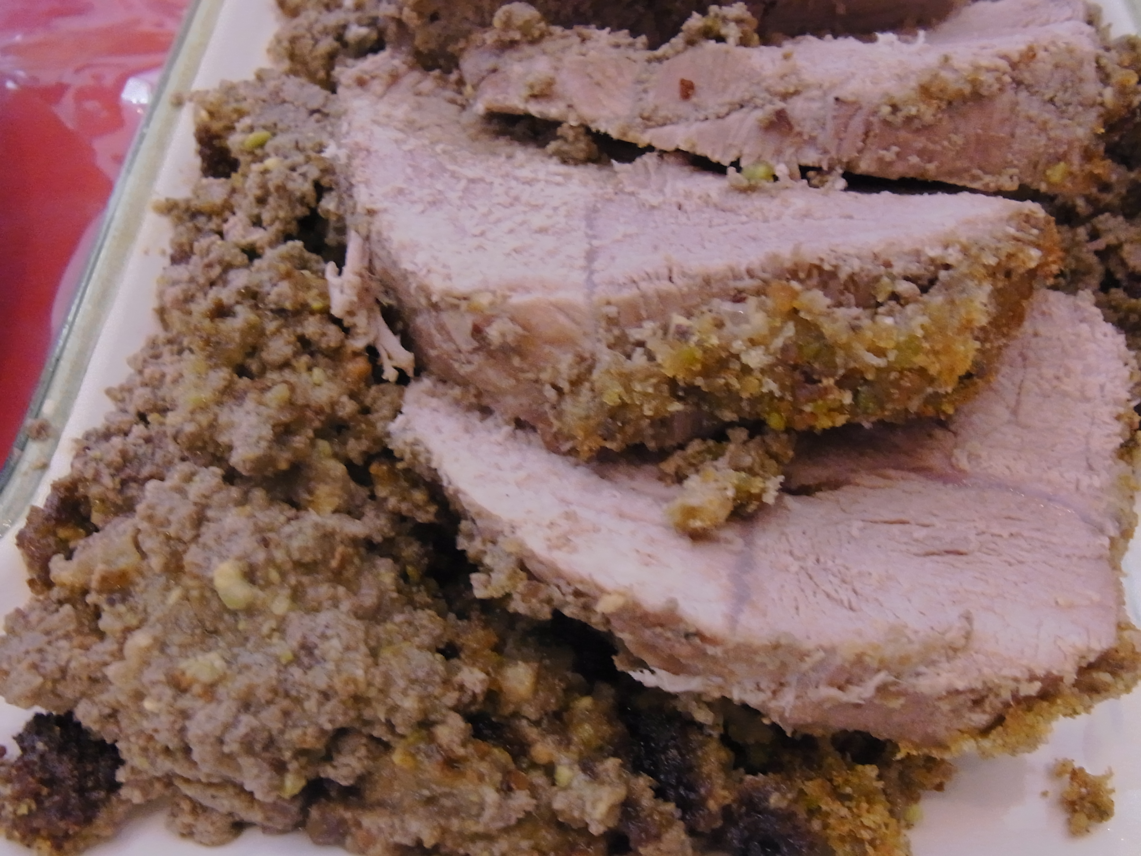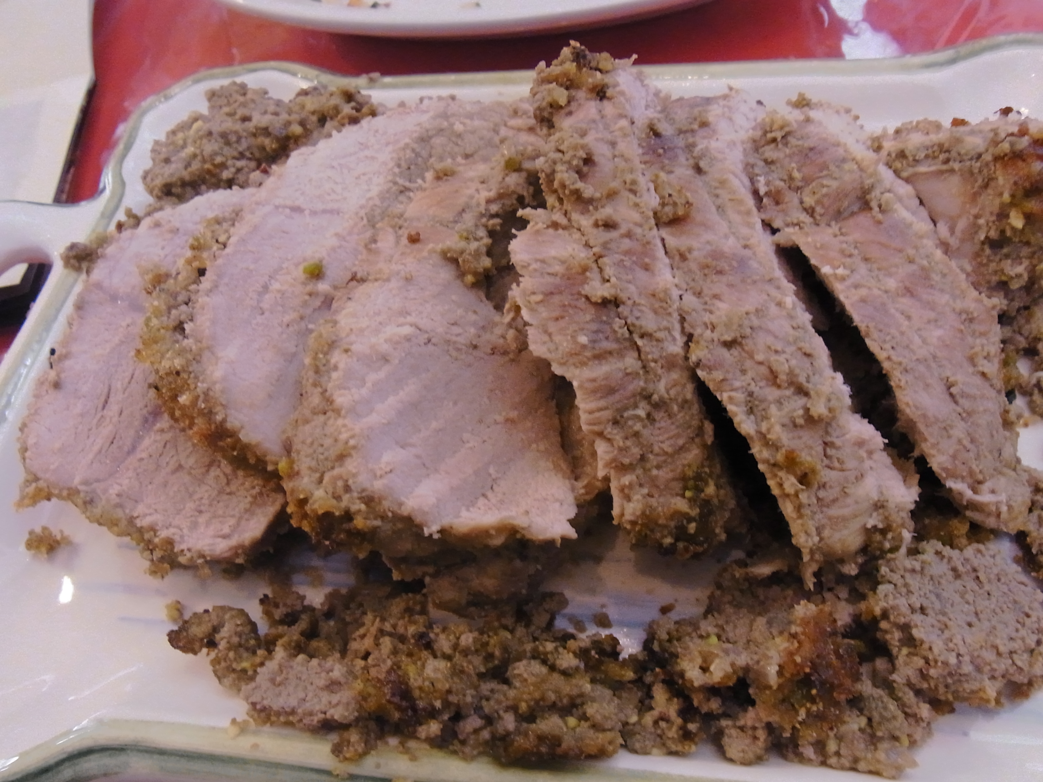 ブロンテ産のピスタチオとレバーペストをコーティングした豚肉のロースト。冷ましても美味しいので、クリスマスなど人が集まる時にお勧めです。